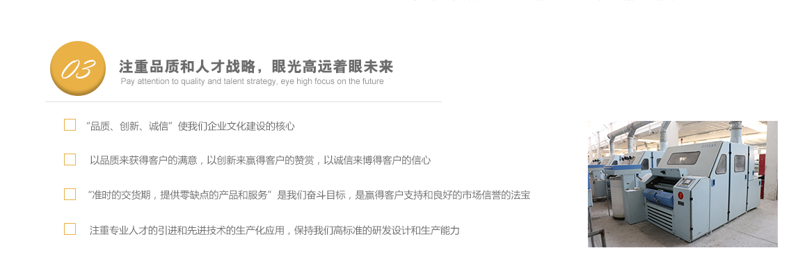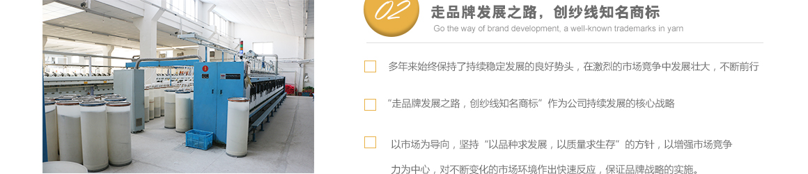 太倉(cāng)市高陽(yáng)工貿(mào)有限公司是專(zhuān)業(yè)從事特種紗生產(chǎn)十?dāng)?shù)年的一線(xiàn)生產(chǎn)廠(chǎng)家,坐落于江蘇省蘇州市太倉(cāng)市雙鳳鎮(zhèn)新湖建湖路29號(hào),太倉(cāng)隸屬長(zhǎng)江三角洲經(jīng)濟(jì)圈,交通便捷,經(jīng)濟(jì)發(fā)達(dá),是著名的紡織生產(chǎn)基地。 公司歷史要追溯到1982年就成立的新湖毛紡織廠(chǎng)。1996年,毛紡織廠(chǎng)與上海二十二棉在新湖聯(lián)合組建了太倉(cāng)市新湖福利綜合廠(chǎng)。2002年為適應(yīng)市場(chǎng)的飛速變化,公司轉(zhuǎn)制重組更名為太倉(cāng)市高陽(yáng)工貿(mào)有限公司。同時(shí)公司適時(shí)調(diào)整生產(chǎn)經(jīng)營(yíng)策略,調(diào)整產(chǎn)品品種結(jié)構(gòu),把生產(chǎn)特種紗作為主要發(fā)展方向,純棉、滌綸竹節(jié)紗是我們的主要產(chǎn)品。 公司多年來(lái)始終保持了持續(xù)穩(wěn)定發(fā)展的良好勢(shì)頭,在激烈的市場(chǎng)競(jìng)爭(zhēng)中發(fā)展壯大,不斷前行。我們把“走品牌發(fā)展之路,創(chuàng)紗線(xiàn)知名商標(biāo)”作為公司持續(xù)發(fā)展的核心戰(zhàn)略。以市場(chǎng)為導(dǎo)向,堅(jiān)持“以品種求發(fā)展,以質(zhì)量求生存”的方針,以增強(qiáng)市場(chǎng)競(jìng)爭(zhēng)力為中心,對(duì)不斷變化的市場(chǎng)環(huán)境作出快速反應(yīng),品牌戰(zhàn)略的實(shí)施。公司注重專(zhuān)業(yè)人才的引進(jìn)和先進(jìn)技術(shù)的生產(chǎn)化應(yīng)用,具備較強(qiáng)的研發(fā)設(shè)計(jì)和生產(chǎn)能力。 公司一直把“品質(zhì)、創(chuàng)新、誠(chéng)信”作為企業(yè)文化建設(shè)的核心。以品質(zhì)來(lái)獲得客戶(hù)的滿(mǎn)意,以創(chuàng)新來(lái)贏(yíng)得客戶(hù)的贊賞,以誠(chéng)信來(lái)博得客戶(hù)的信心。我們把“準(zhǔn)時(shí)的交貨期,提供零缺點(diǎn)的產(chǎn)品和服務(wù)”作為奮斗目標(biāo),贏(yíng)得了客戶(hù)的支持和良好的市場(chǎng)信譽(yù)。 高陽(yáng)工貿(mào)有限公司愿與廣大客戶(hù)加強(qiáng)合作,共享信息,迎接挑戰(zhàn),共同發(fā)展。客戶(hù)需求。了解詳細(xì)>>
